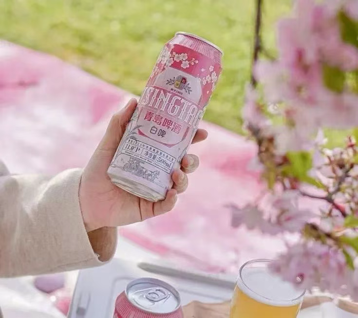 青岛啤酒最近推出了“樱花味白啤”,以其刚刚荣获金奖的白啤打底,取名“醉樱浮白”,还与消费者共创国风包装设计,一上市就引发关注。